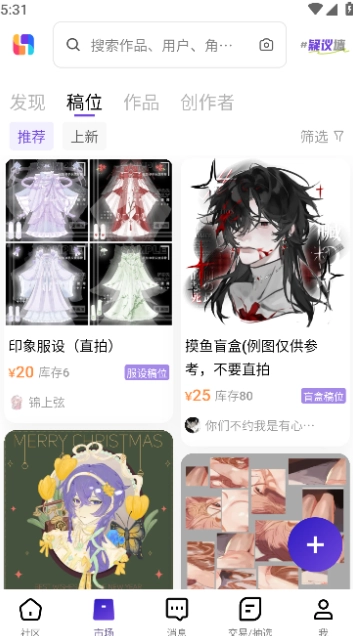 然后用户们可以在市场上欣赏他人的原创画作,然后找自己心仪的画师约稿