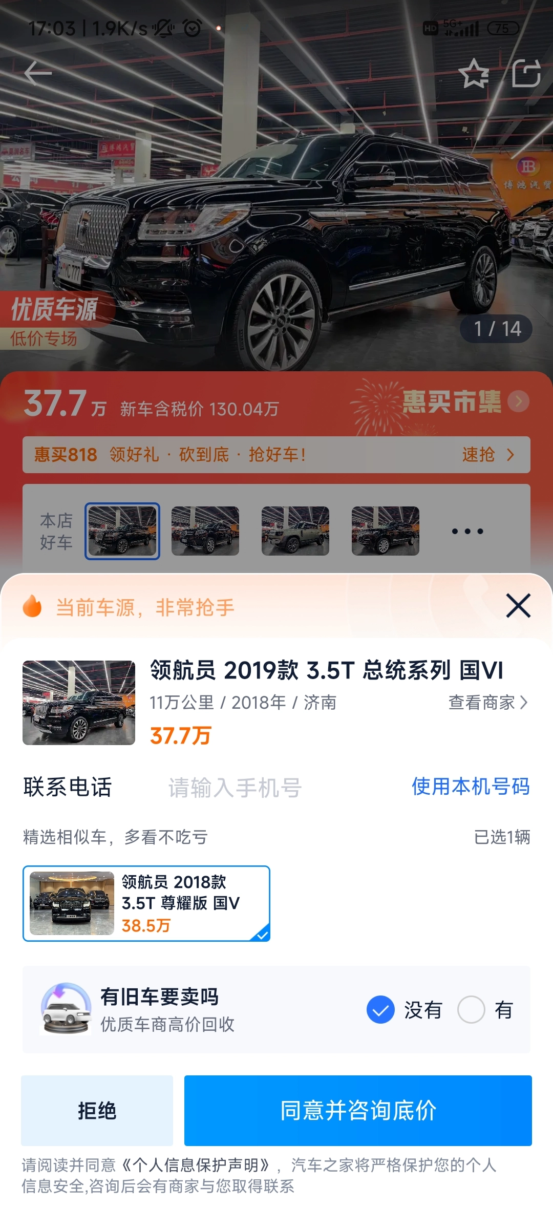 4、填入本人电话号码,点击【同意并询问底价】。
