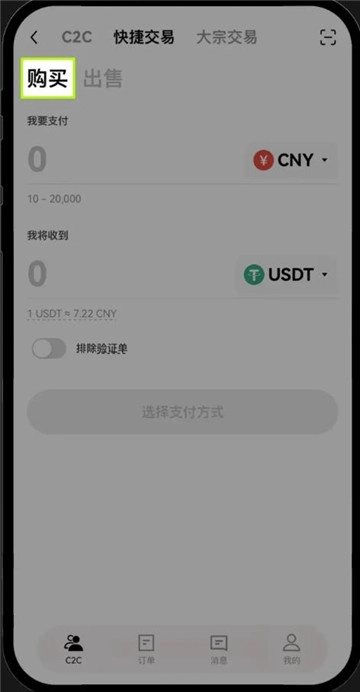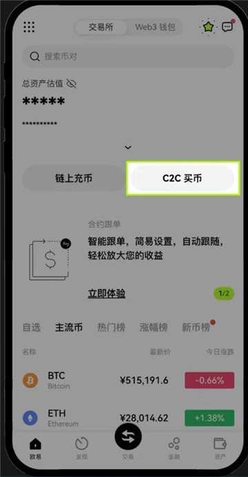 一、进入易欧web3钱包首页,点击“C2C买币”,接着点击“快捷买币”,然后点击“购买”,最后选择你想要购买的数字资产。