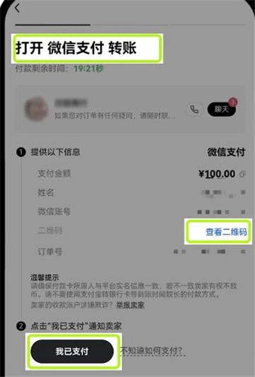 3. 下单成功后,页面将展示卖家的付款方式,你需依照卖家的付款信息完成线下付款。打款结束后,点击底部的“已付款”,并告知卖家放币。