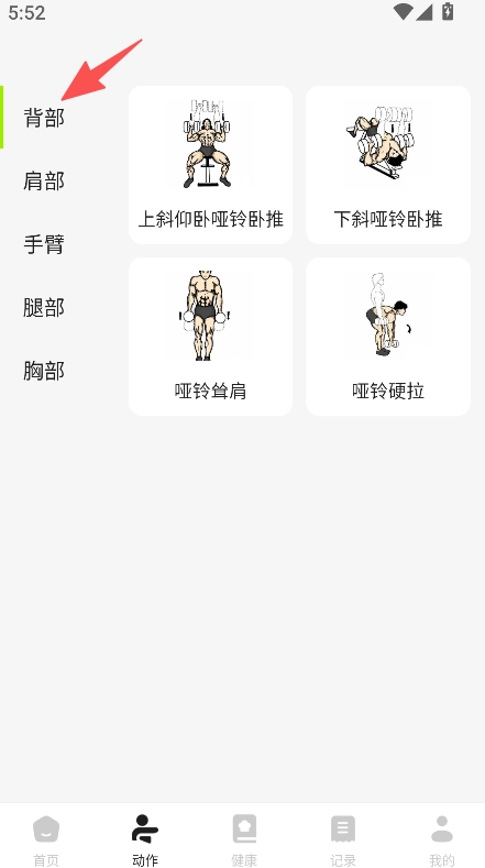2. 选取背部、肩部等动作部位,查看具体的健身动作。
