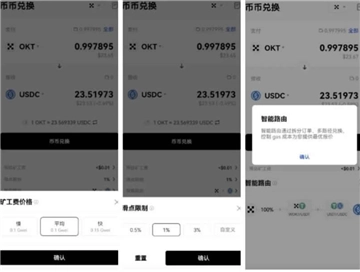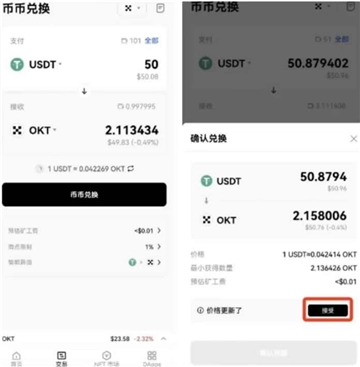 4、当询价结束且完成授权后,您能够点击「币币兑换」按钮来发起交易,随后在二次弹窗里确认交易信息,接着点击「确认兑换」按钮,并在钱包中进行确认,以此完成交易。另外,要是在这个过程中交易价格出现变动,您必须在二次弹窗中点击「接受」按钮,接受新的报价,然后点击「确认兑换」,并在钱包中确认,方可完成交易。
