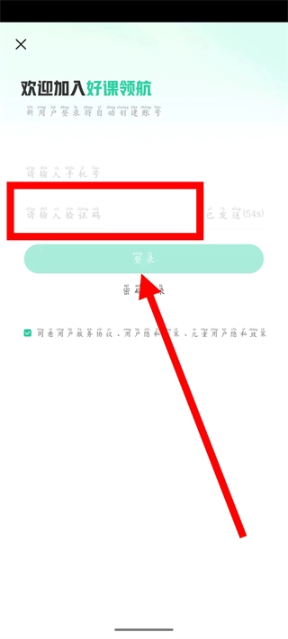 3、在登录页面,输入手机号后,获取并输入验证码。