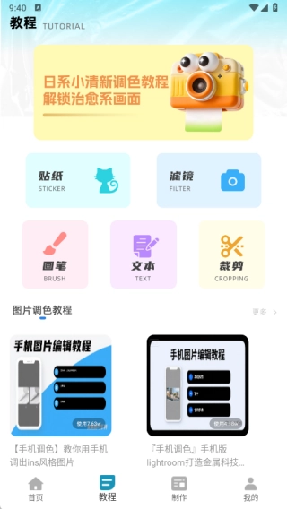3、在教程页面中有贴纸、滤镜、画笔、文本、裁剪以及图片调色教程;