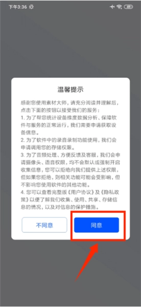 1只需在温馨提示窗口点击“同意”,就能顺利进入素材大师应用。