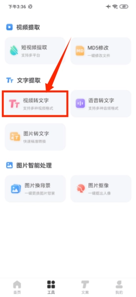 2. 在工具界面中,选择“视频转文字”功能,随后进入文案提取页面。