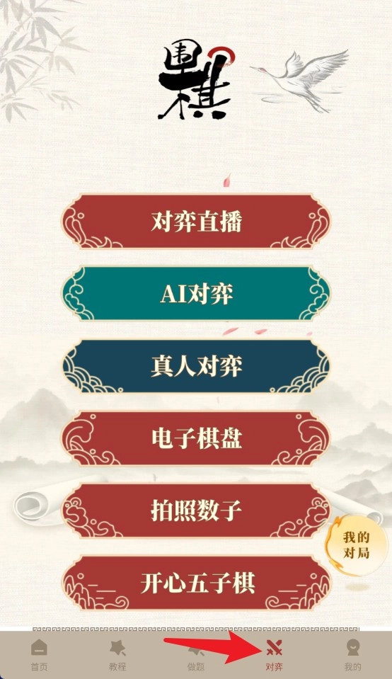 4、通过对弈标签页可进入AI对弈、真人对弈、电子棋盘与拍照识局等实战功能区。