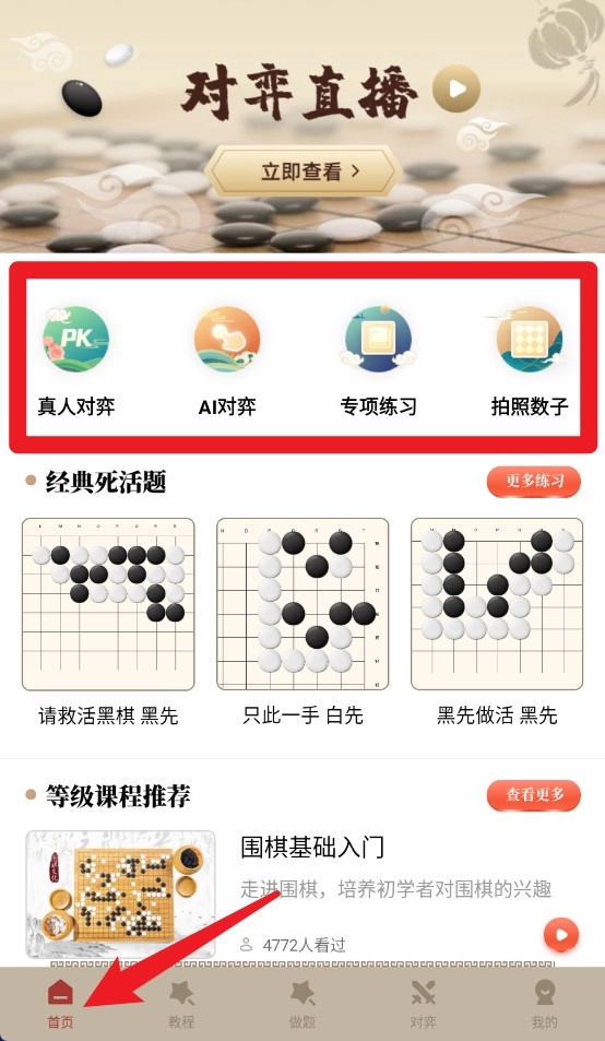 1、在首页功能区可看到真人对弈、AI对弈、专项练习及拍照数字等主要功能入口。
