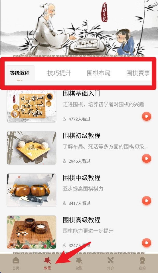 2、点击教程标签后,可依序学习围棋基础、初级、中级与高级等进阶课程内容。