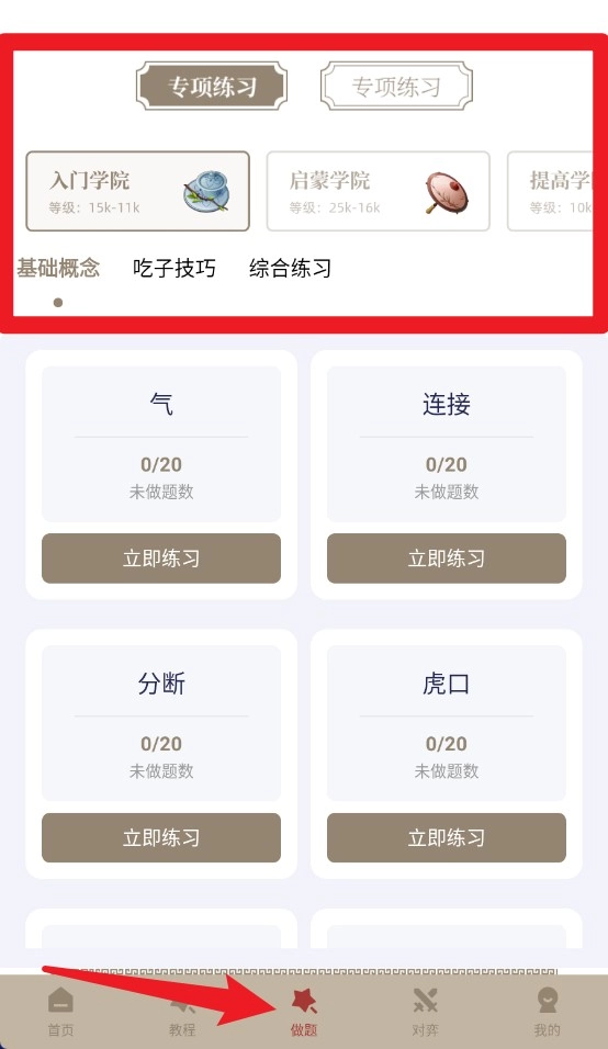 3、在做题页面可依等级选择学院,进行气、连接、分断等围棋专项训练题目。