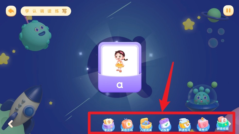 1. 在首页的功能区域,能够看到学、认、调、读、练、写这六大模块,它们涵盖了拼音学习的整个过程。