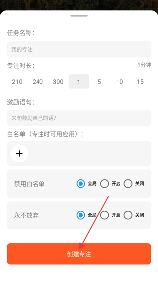 3、于创建页面设定任务名称、专注时长、激励语句等相关信息后,点击【创建专注】按钮。