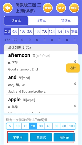 4、于单词学习页面,能够挑选【学单词】【做测试】【磨耳朵】等功能,并且还能够设定单次学习或者测试的单词数量,以此开展单词学习。