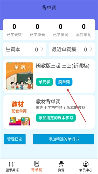 3、回到背单词界面,点击已添加教材旁的【刷单词】,进入单词学习页面。