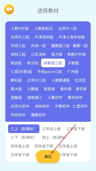 2、在选择教材页面,选择对应的教材版本和年级,点击【确定】。