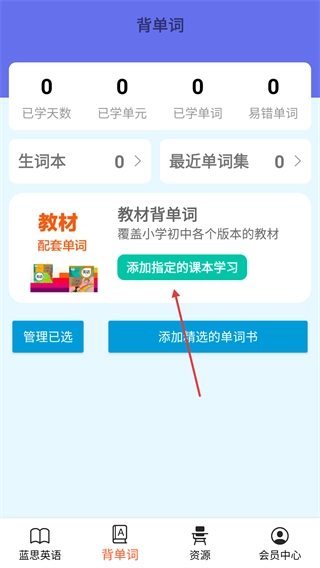 1、在背单词界面,点击【添加指定的课本学习】,进入教材选择页面。