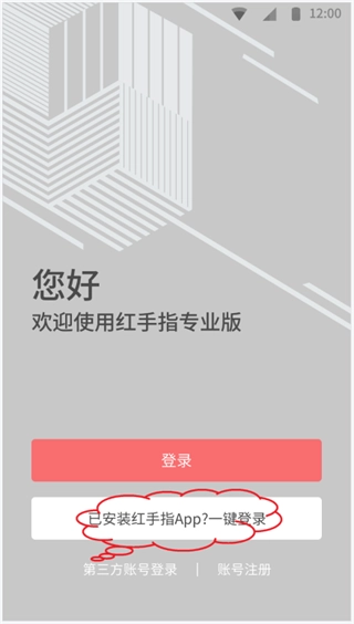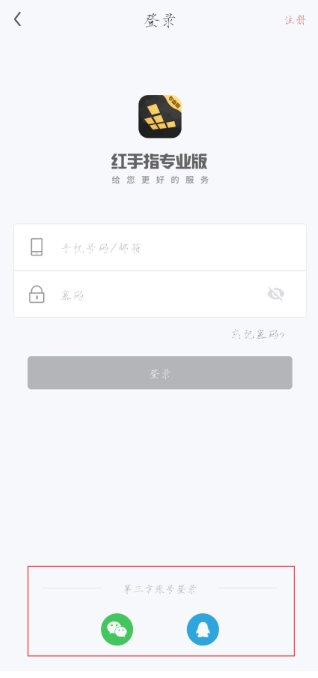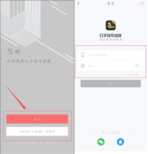 1、打开红手指专业版后,点击首页的“登录”按钮,在弹出界面中输入已注册的账号与密码即可完成身份验证,成功登录后系统将自动保存信息,下次启动时无需重复操作;