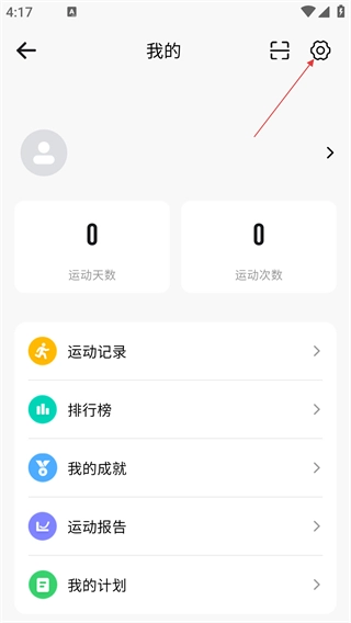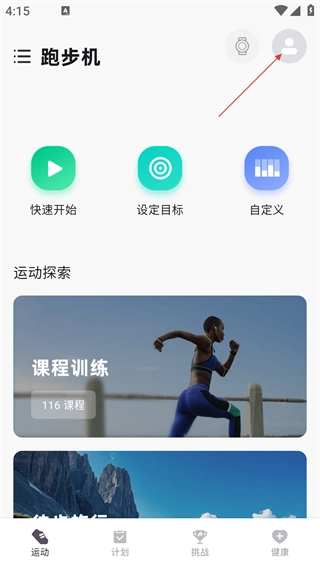 1. 在跑步机界面,轻点右上角的个人头像图标,即可进入【我的】页面。