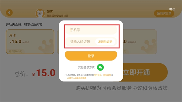 4、于登录页面,填入手机号与验证码,接着点击【登录】按钮,就能开通会员。