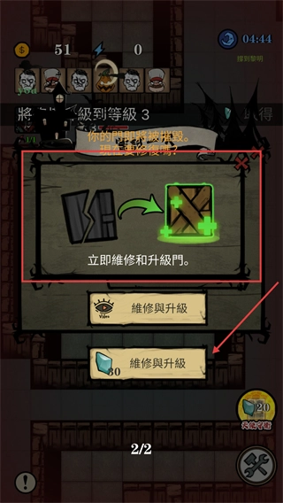 3、门即将被摧毁时,用30钻石修复并升级门,加固防线,防止怪物突破防御造成失败。
