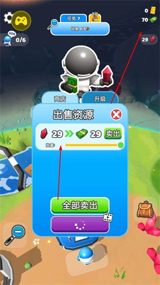 4、出售收集的资源获取钞票,用于升级、解锁新内容,持续挖掘、升级、交易。