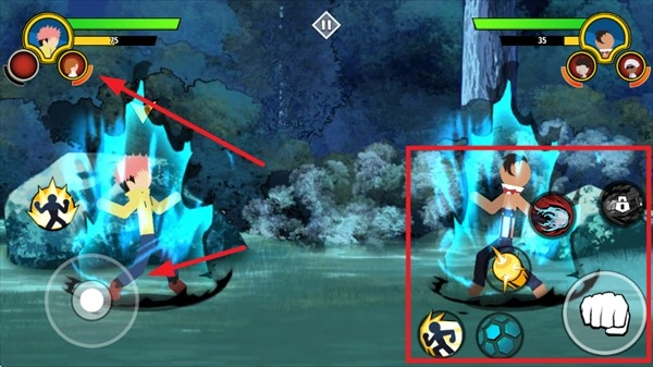 4、左侧摇杆用于角色移动,右侧按键分别对应技能攻击、防御操作,当屏幕上方蓝色能量条蓄满时,即可释放大招。