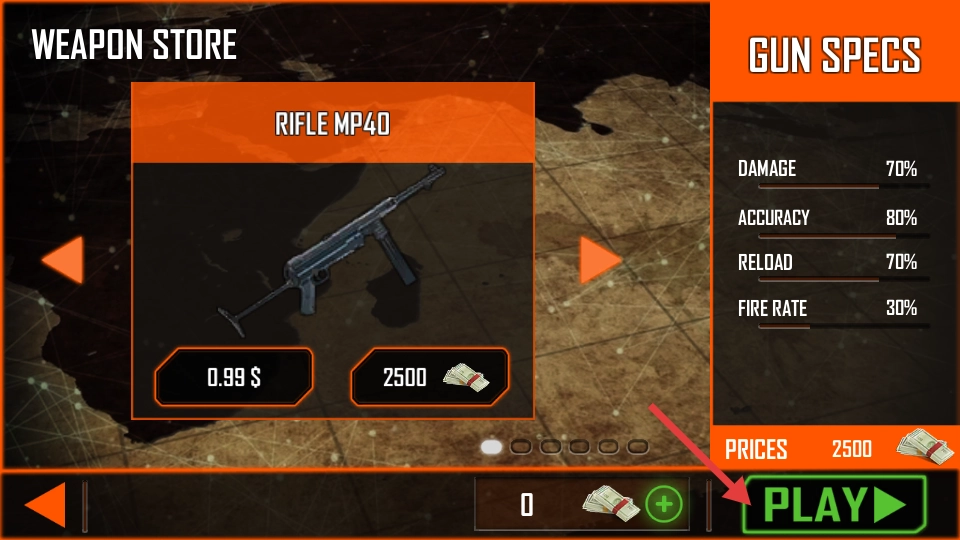 3、在武器商店能够购买武器,像MP40步枪,购买它需要花费2500游戏货币。该步枪在伤害、精准度等属性方面表现良好,购买完成后点击“PLAY”即可进入战斗。