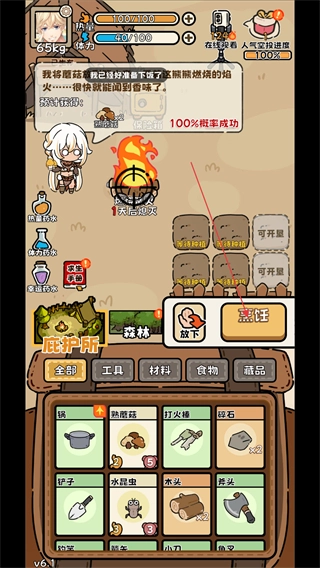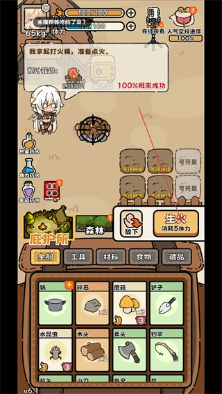 3、点击篝火放置点后,弹出生火按钮,消耗5点体力升起营地的第一把火。