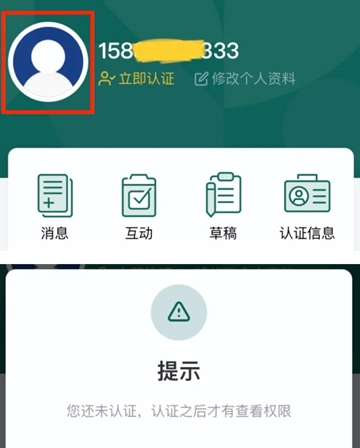 3、点击头像,会提示您还未认证小雇,想要正常使用小雇端全部功能的话,请点击去认证。
