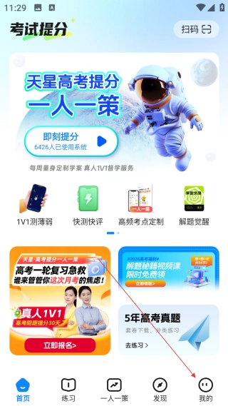 1. 在考试提分的首页,轻点底部的【我的】,即可进入个人中心的功能页面。