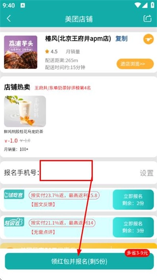 3、在美团店铺详情页面填写手机号后,点击领红包并报名按钮完成报名操作。