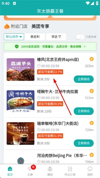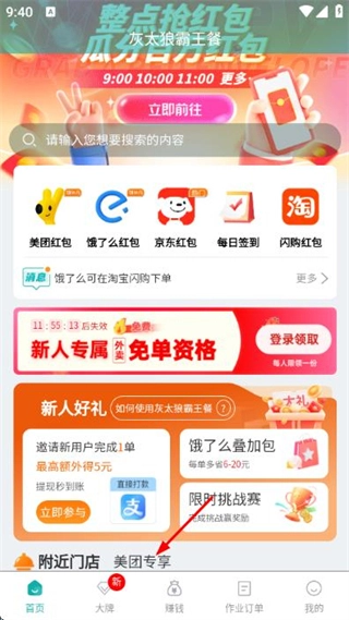 1、在首页找到美团专享区域并点击,即可进入灰太狼霸王餐的店铺列表页面。