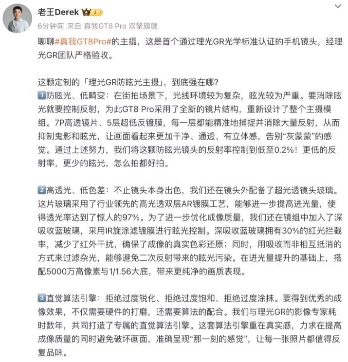 10月13日消息,真我副总裁王伟@老王Derek今天下午通过微博,详细介绍了真我GT8Pro手机搭载的主摄。他表示,该镜头是首个通过理光GR光学标准认证的手机镜头,并且经理光GR团队严格验收。