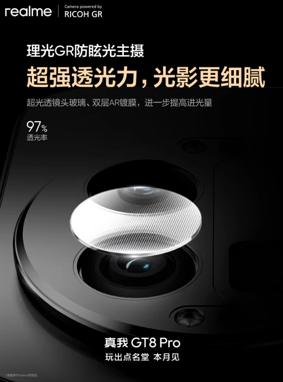 防眩光、低畸变:为了消除眩光、控制反射,GT8Pro采用了全新的镜片结构,重新设计了整个主摄模组。7P高透镜片、5层超低反镀膜,每一层都能精准地捕捉并消除大量反射,从而抑制鬼影和眩光,让画面看起来更加干净、通透、有立体感,告别“灰蒙蒙”的感觉,并使镜头的反射率控制到低至0.2%。