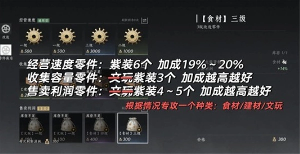 三品类(食材、建材、文玩)各自凑齐利润+20%与库存+20%的四件套。