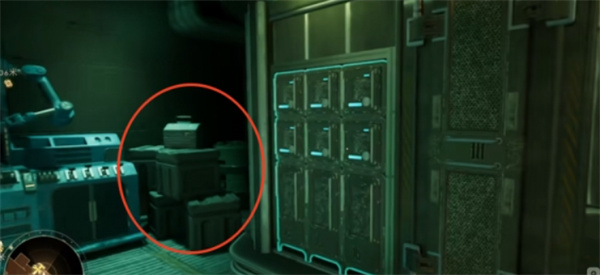 2、进入房间后,将视角向左转动,可以看到一堆堆叠的箱子。利用跳跃动作登上去。