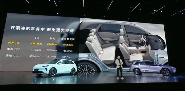 尚界H5定位于B级SUV,长宽高分别为4780/1910/1657(1664)mm,轴距2840mm,车身尺寸属于典型的B级SUV尺寸,但车内空间却达到了C级车的尺寸,乘员舱空间为1908mm,超越奔驰、奥迪两款豪华SUV。