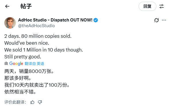 官方于推文中称:“要是能两天卖出八千万份,那可就太棒了。然而,我们实际上是花了十天时间才卖出一百万份。”