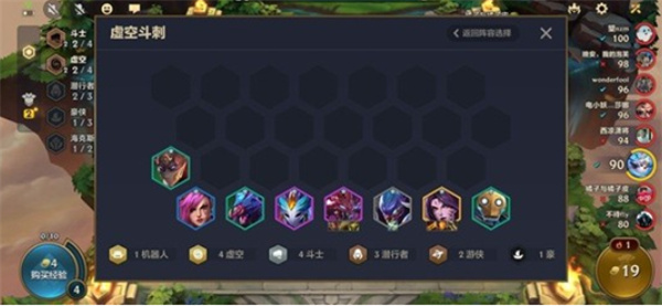 在升级阶段多留意体系必备的卡牌,虚空阵容整体不依赖大量三星,所以经济压力相对较小,可以视情况追一下斗士的三星来强化前排。
