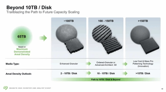 即便是当前6.9TB的单碟容量,也已经可以做到55TB容量的硬盘了,单碟15TB时代100TB+容量也不是问题了,记得之前多年希捷PPT上就有过2030年之后实现100TB的目标。
