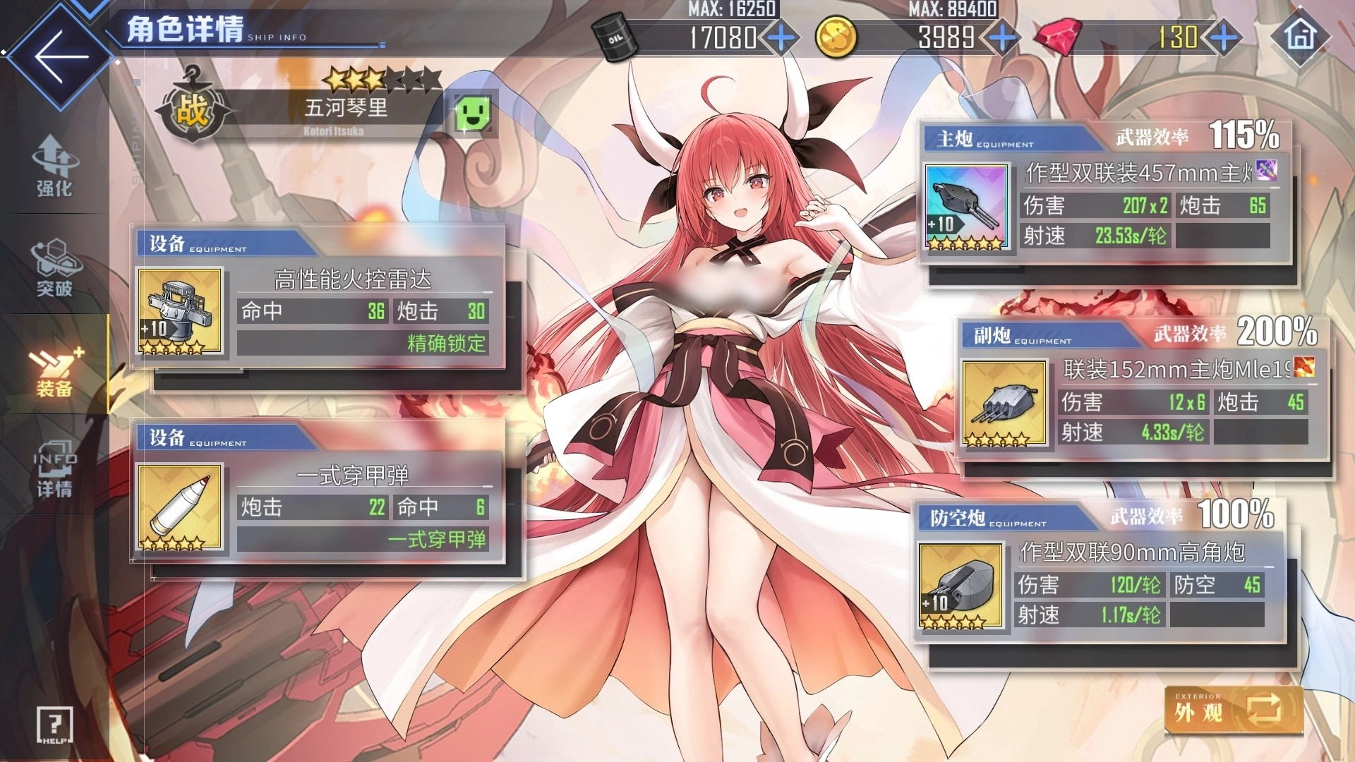 与此同时,五河琴里的专属兵装灼烂歼鬼能够进一步增强她的生存能力。在战斗过程中,一旦五河琴里的耐久降至70%以下,她便会缓缓为自身恢复耐久,具体效果是每5秒恢复2%。除此之外,五河琴里在舰装搭配方面,与常规金战列的配装并无太大差异。若有彩炮,优先使用彩炮;要是没有彩炮,就选用欧根炮、弗兰炮或者紫MK6。防空炮首选STAAG,副炮装备任意泛用轻巡炮即可。在没有调速要求的情形下,金火控加白弹是非常适合五河琴里的设备选择;要是存在调速需求,那么就利用黑弹、弹链等设备来进行调速。