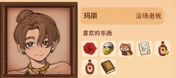 喜爱的物品包括:香醇野莓酒(通过烹饪获得)、香醇野莓酒(通过烹饪获得)、金面具(由冥滩怪兽掉落)、《掷骰秘诀》(于夏/秋火年的故事角获取)