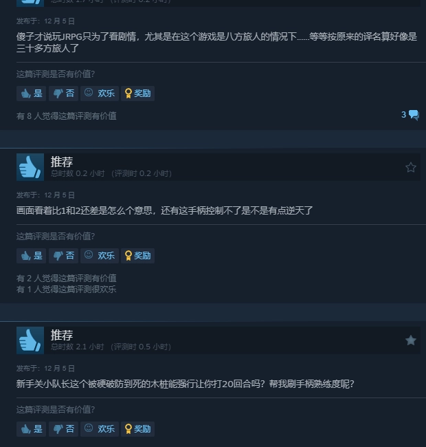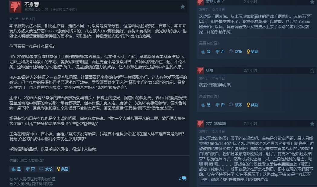 但也有玩家指出,本作没有了HD-2D像素风格引以为傲的构图与光影,是手游级别的品质以及手游的风格;也有玩家抱怨豪华版特典的缺失,这在今年新游戏的首发情况中已是屡见不鲜的现象,同时也有手柄适配很差劲的情况。