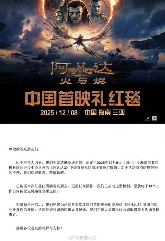 不过,有网友称自己突然收到了关于红毯活动取消的邮件通知:“由于不可抗力因素,我们怀着遗憾的心情告知您:原本计划在2025年12月8日(星期一)于海南三亚红树林国际会议中心举行的《阿凡达3》中国首映礼红毯环节已确定取消。对于此次活动取消给您造成的不便,我们致以诚挚的歉意,还望您能够谅解。”
