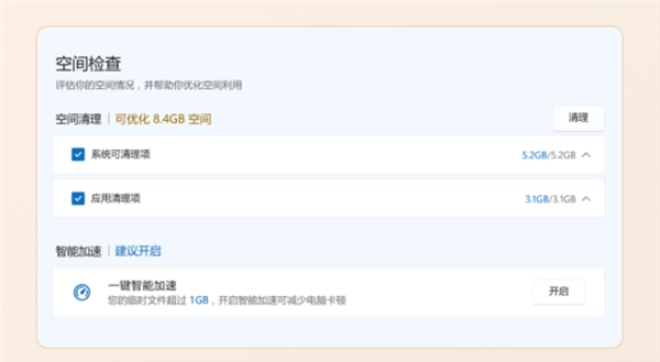 具体来看,微软电脑管家3.18版支持评估存储空间,可检查存储空间使用情况,识别可优化项,并提供智能加速选项,可一键智能加速减少电脑卡顿。