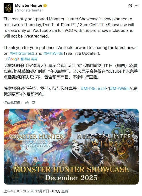 官方透露,此次节目设有预热环节与正片内容,将着重公布《怪物猎人物语3》《怪物猎人:荒野》免费第四次大型更新等系列作品的最新消息。