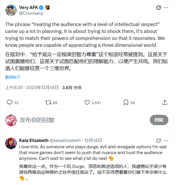 预告片所展现的黑暗成人化叙事,赢得了许多玩家的赞赏,他们认为拉瑞安没有为了迎合大众而“净化故事”。对此,工作室发行总监迈克尔·道斯在社交媒体上回应称,这种叙事选择源于对玩家智识的尊重。“这并不是为了震惊他们,而是试图匹配他们的理解能力,从而引发共鸣。我们知道玩家有能力欣赏一个立体的世界。”他透露,这种“将观众视为智力平等的对话者”的理念在项目规划中被多次强调。