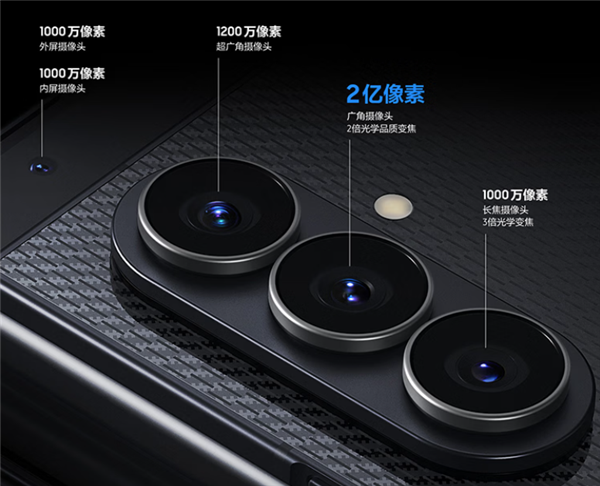 背部配备三摄模组,分别是2亿像素广角主摄(ISOCELL HP2)、1200万像素超广角+1000万像素长焦,内外屏各配1000万像素的挖孔前置镜头。