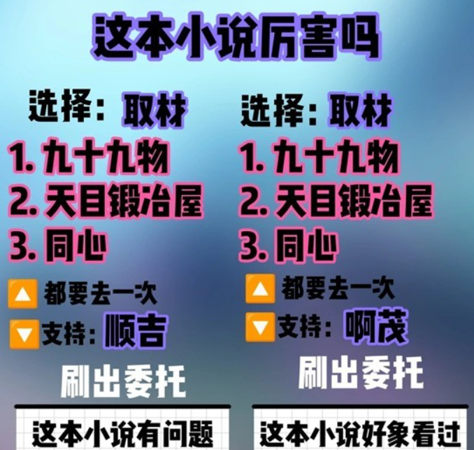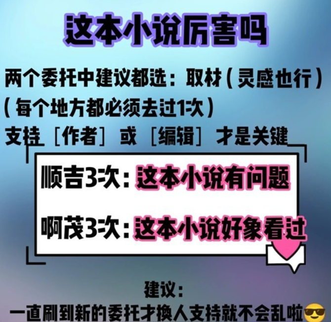 个人建议: 选择顺吉直到接到委托【这本小说有问题】,完成后续任务后,下一次再选择阿茂,就能接到【这本小说好像看过】