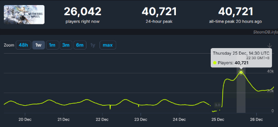 根据SteamDB的数据,12月25日晚间22点30分,该游戏的同时在线玩家峰值达到了40721人,这一数字超过了此前所有版本更新时的玩家数量峰值。